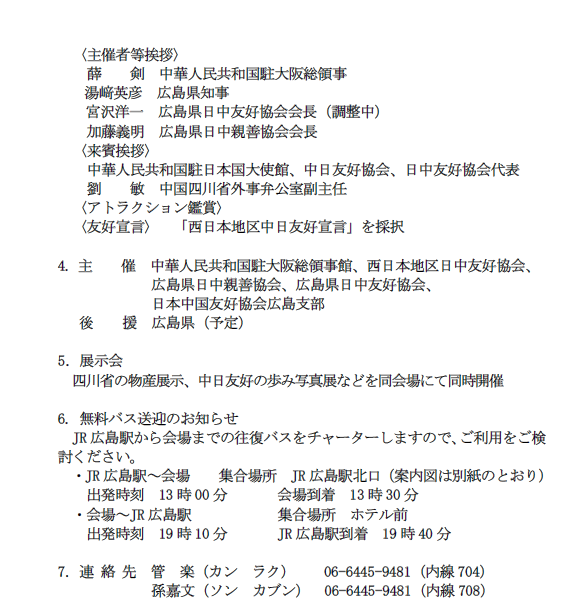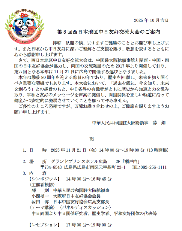 さて、中華人民共和国駐大阪総領事館の主催により、別添のとおり第8回西日本中日友好交流大会が広島市内で開催されます。この大会は、日中両国の交流の更なる発展のため、総領事館が所管されている関西、中国、四国の日中友好協会などが協力して2017年から開催されており、戦後80周年の節目の今年、広島で開催される運びになりました。日中交流の各方面の関係者が多数参加される大会です。中国人留学生や日本人学生の皆さんにも、積極的にご参加いただき交流を深めていただきたいと考えています。