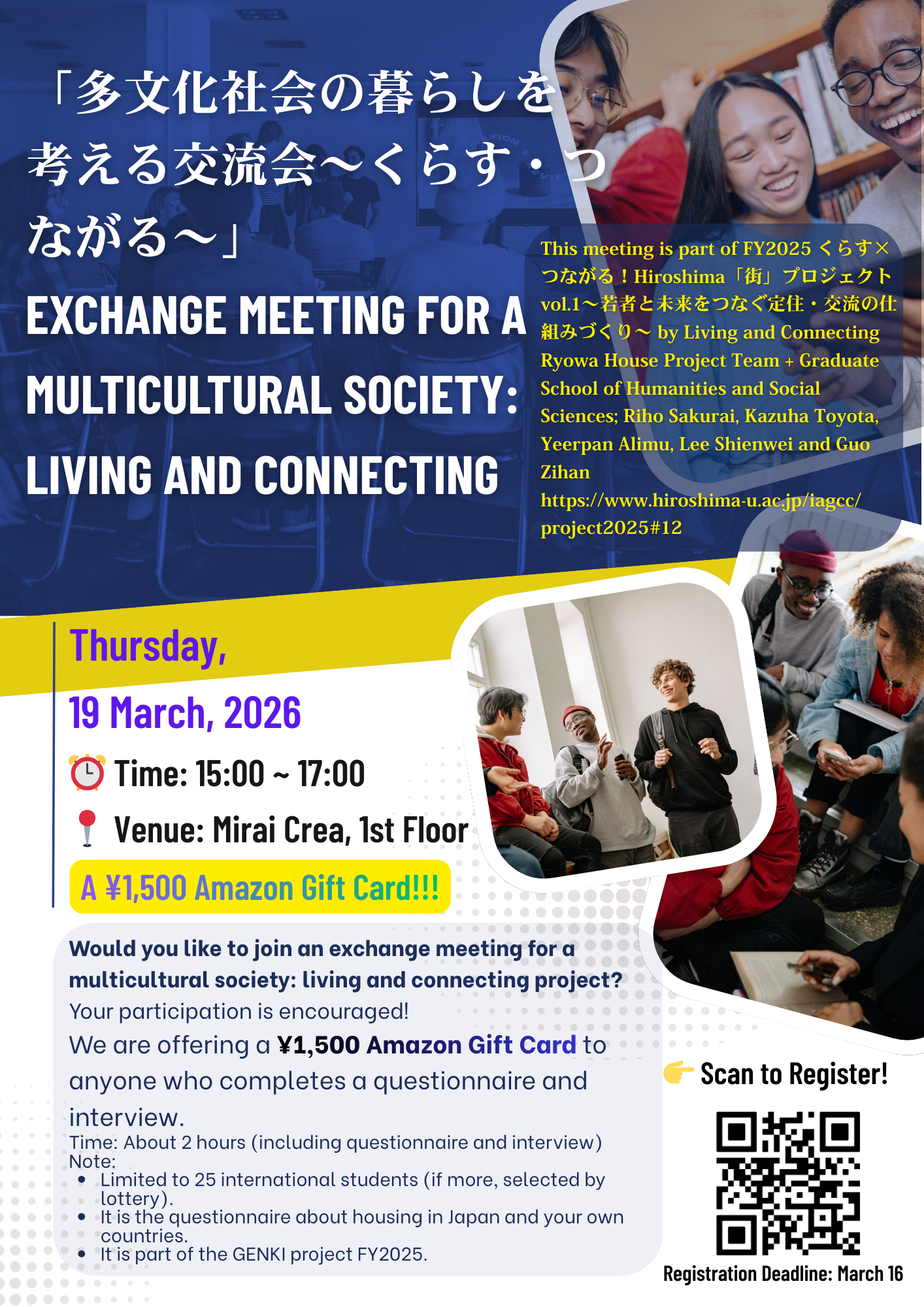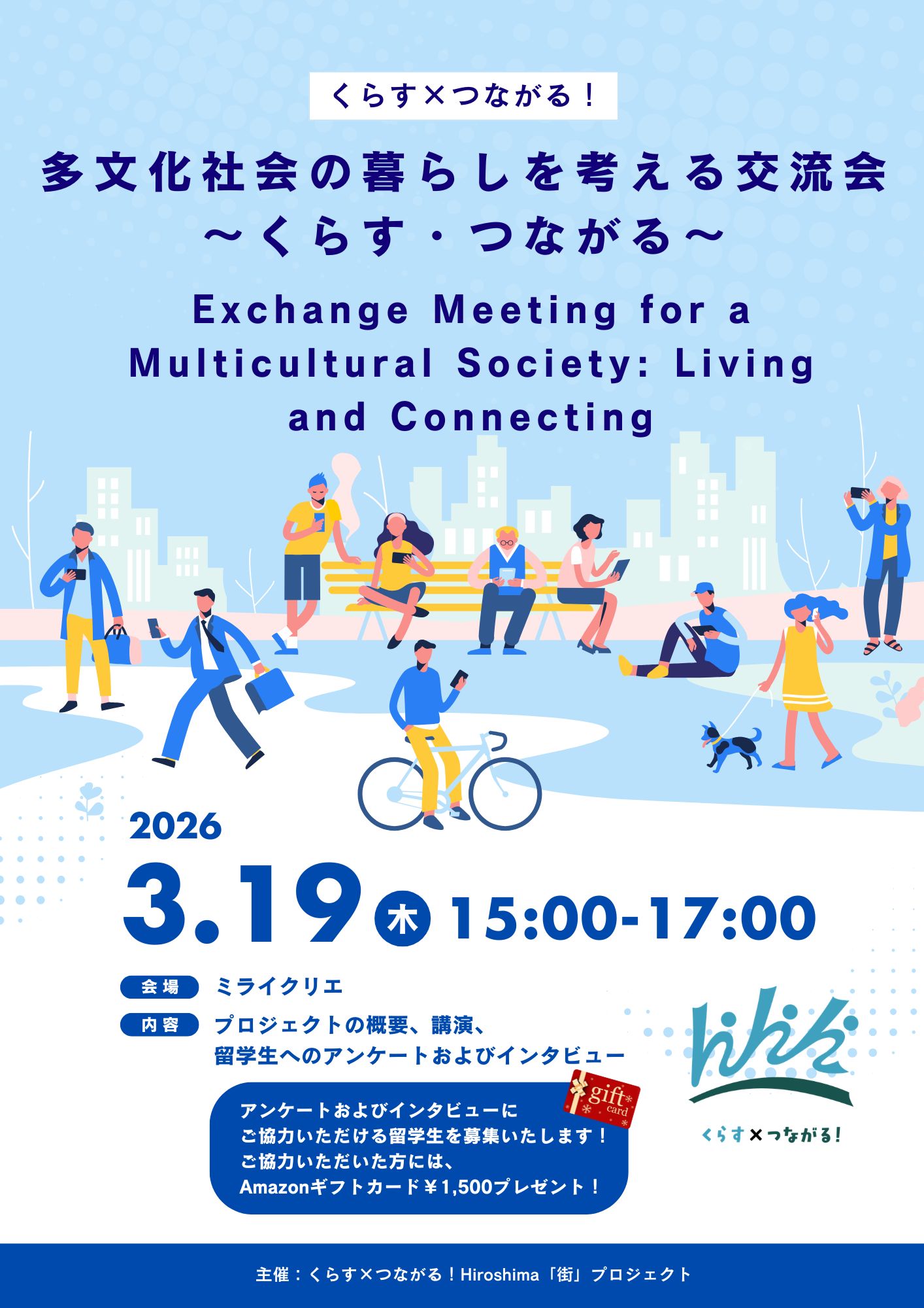 We will be holding an exchange meeting for a multicultural society: living and connecting. please refer to the flyers. 【日時】2026年3月19日(木) 15:00~17:00