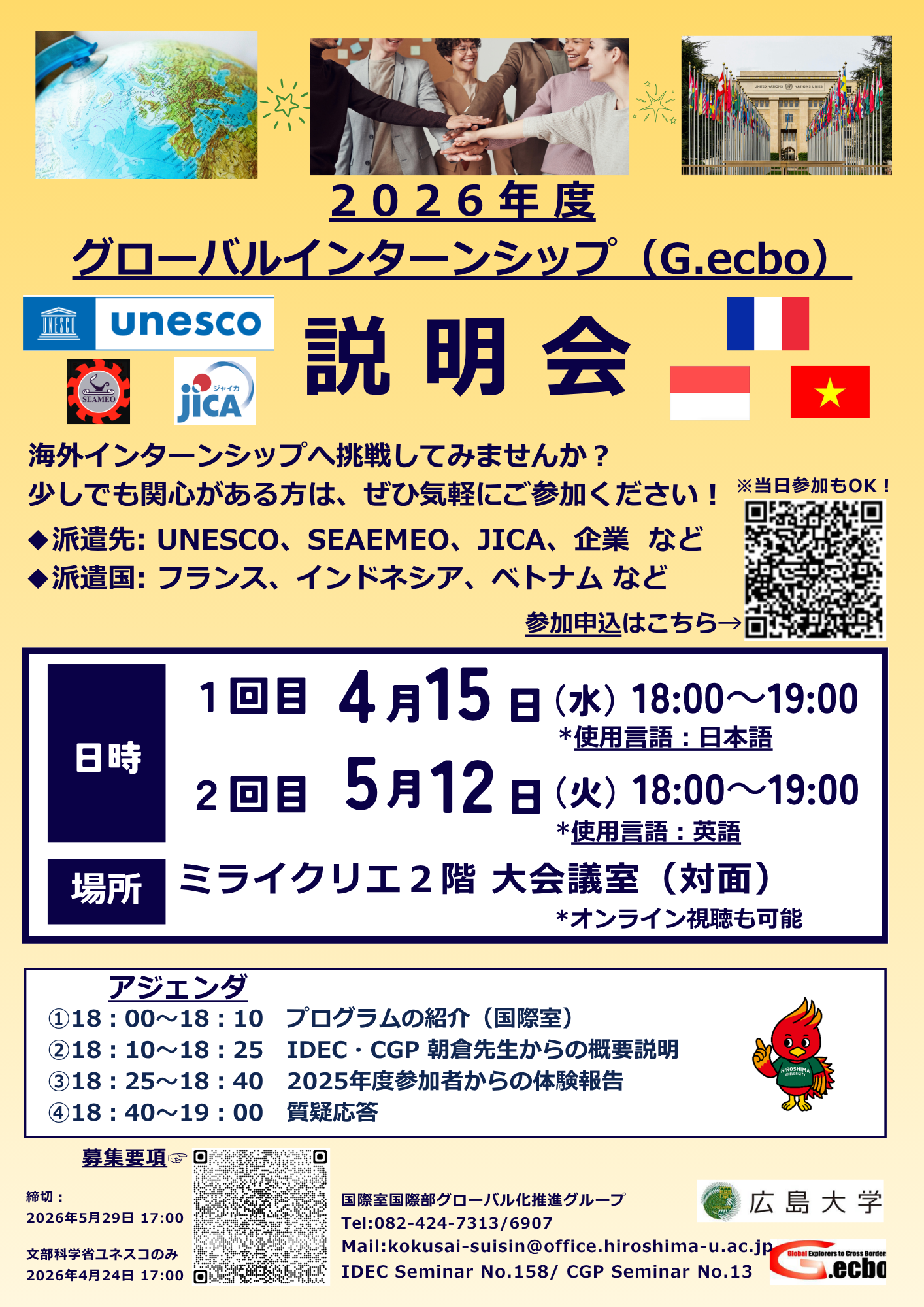 以下の日程で、2026年度グローバルインターンシップの説明会を開催します。ご興味ある方はぜひ、ご参加ください。