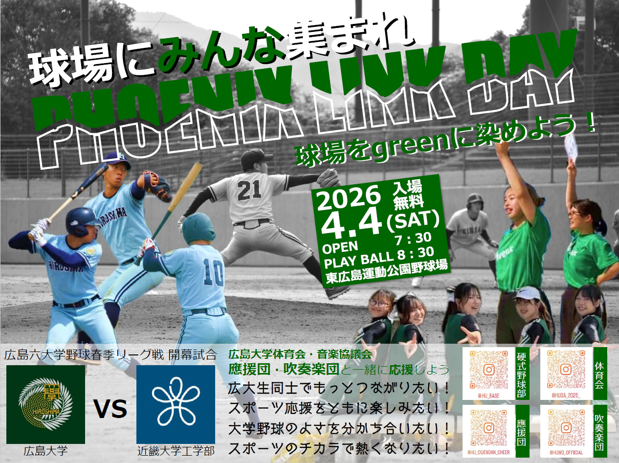 硬式野球部では4/4(土) 8時30分PB vs近畿大学工学部 @東広島アクアスタジアムでの試合でフェニックスリンクデーとして、球場に学生に来てもらい、広島大学硬式野球部をみんなで応援してもらうイベントを企画しています。詳細はポスターをご覧ください。ぜひ球場にご来場いただき、みんなで広大野球部を応援しましょう!!