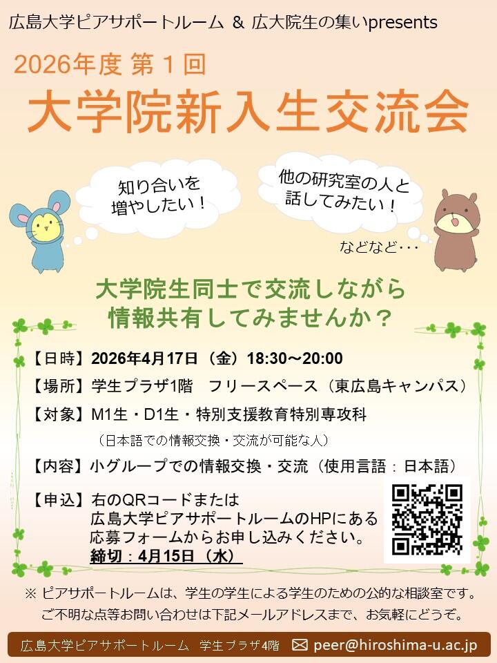 - 2026年度第1回大学院新入生交流会のお知らせ (広島大学ピアサポートルーム)